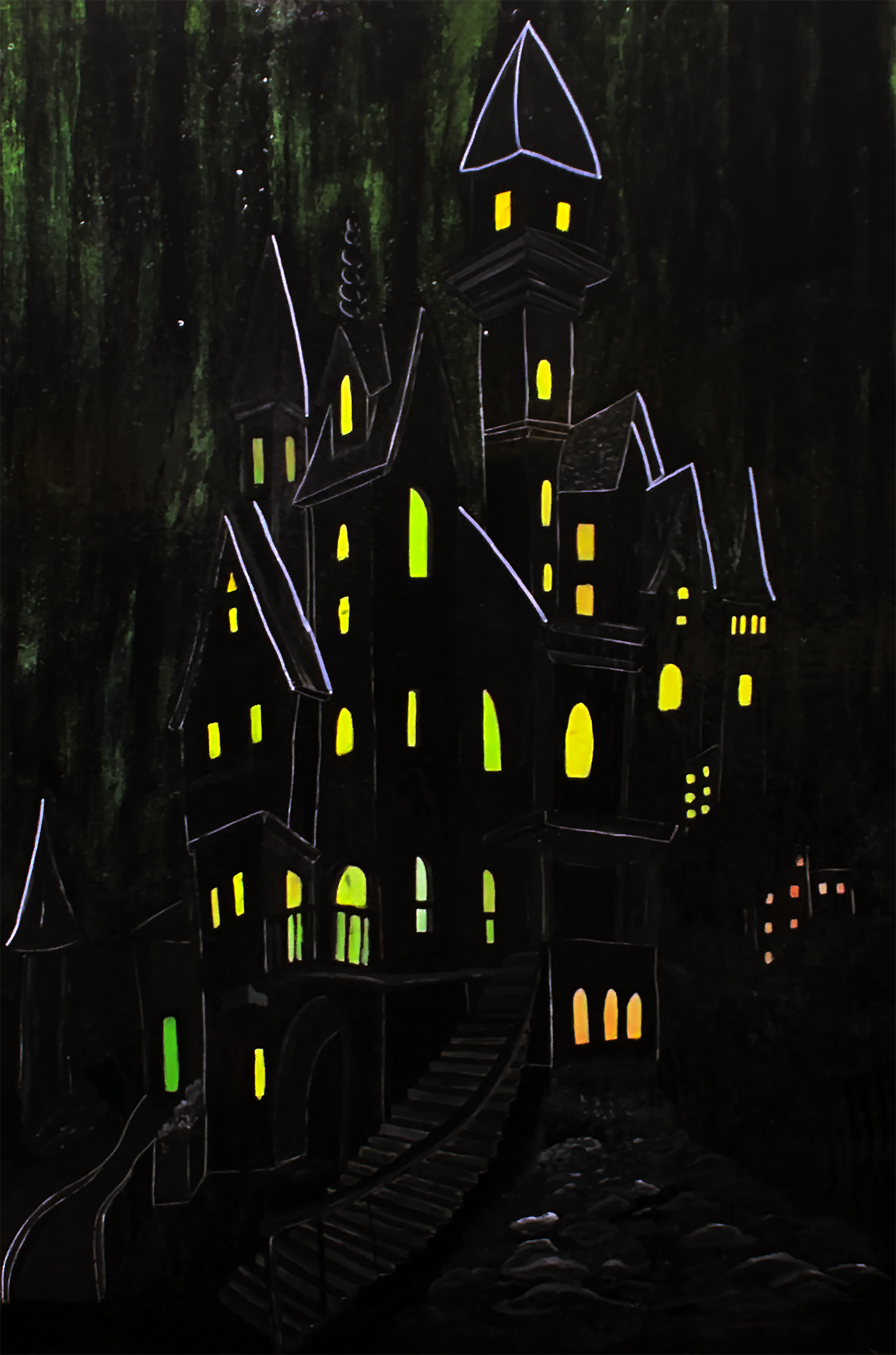 "Haunted Ascent" welcomes you into a spellbinding scene of eerie elegance through this original acrylic and resin painting. Featuring a gothic mansion illuminated by glowing green, amber, and orange windows, it looms mysteriously against a dark forest. Its fantastical design—with winding towers and crooked staircases—creates a mesmerizing and haunting dreamscape. Perfect for fans of fantasy, gothic art, or subtle spooky vibes, this striking artwork adds ghostly warmth and intrigue to any room. The windows and smoky green effects glow softly in the dark after being exposed to light during the day. Measuring 24" wide by 30" high and 1.5" deep. Colors may differ slightly across monitors.